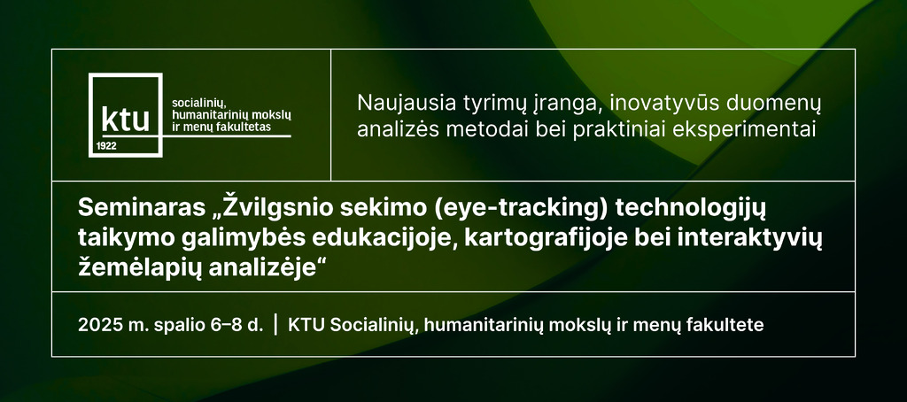 KTU Socialinių, humanitarinių mokslų ir menų fakultete spalio 6–8 d. vyks seminaras, kurį ves Palackio universiteto (Čekija) tyrėjai. Renginio metu bus pristatoma žvilgsnio sekimo technologijų taikymo edukacijoje, kartografijoje ir interaktyvių žemėlapių analizėje galimybės, naujausia įranga, inovatyvūs duomenų analizės metodai bei praktiniai eksperimentai. Paskaitos vyks anglų kalba.